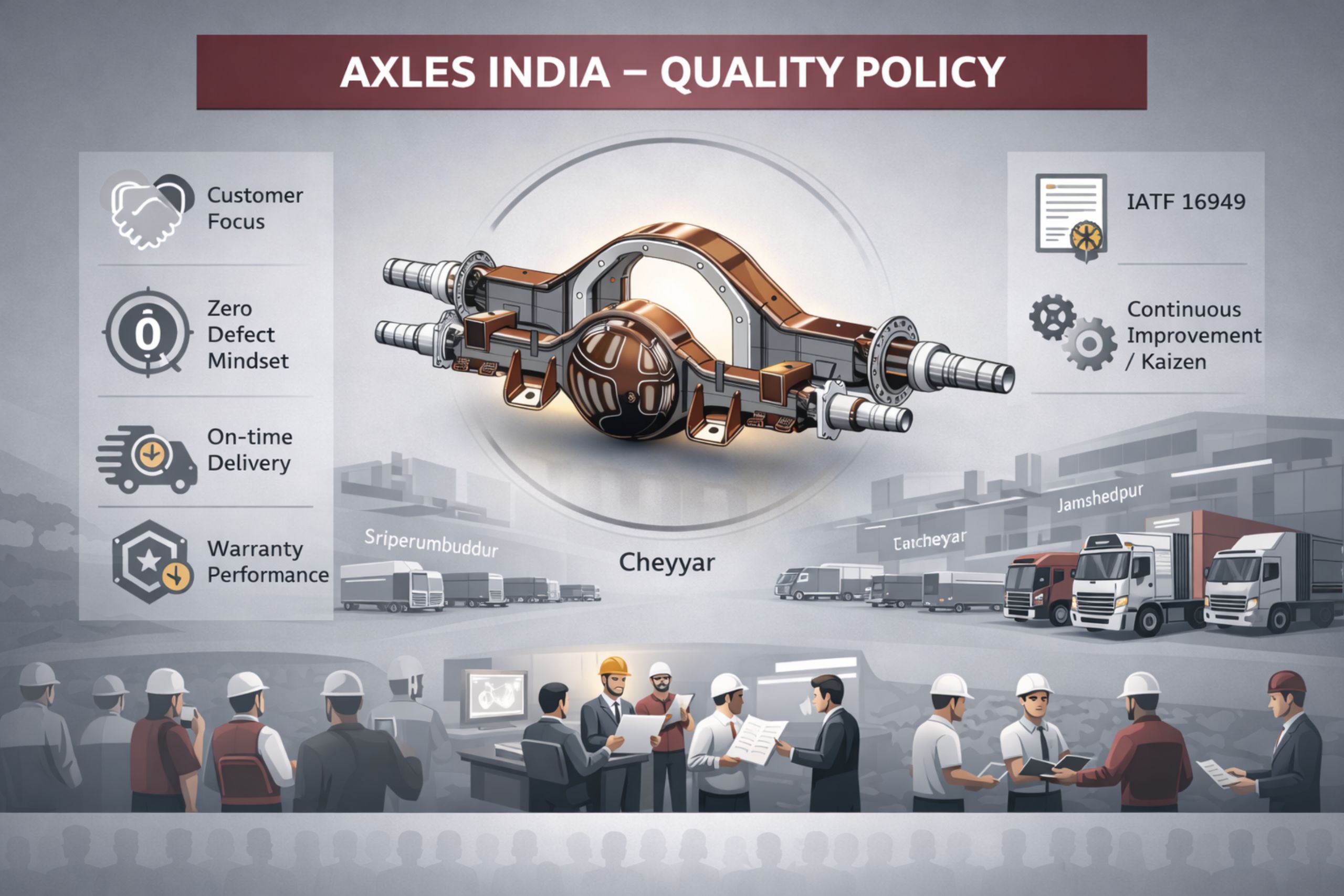 Axles India commenced production at its Sriperumbudur plant, with an annual volume of 10,000 axle housings to Ashok Leyland. In 1995, to meet the increased demand of domestic OEMs, an additional facility for Axle Housings was set up at Cheyyar. In 2003, facility to manufacture Drive Head assemblies was installed. In 2006, production lines were established for catering to export markets. In 2011, Drive head business was sold to Dana India Private Limited. In 2025, a plant was established in Jamshedpur.